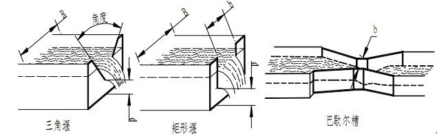 常用的量水堰槽有,直角三角堰、矩形堰和巴歇爾槽(如下圖)
