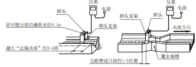 超聲波明渠流量計的探頭可以直接安裝在量水堰槽水位觀測點的上方。探頭發(fā)聲的一面要對準水面??梢杂盟匠叻旁谔筋^上蓋上,通過校上蓋水平使探頭對準水面。巴歇爾槽水位觀測點在距喉道2/3收縮段長位置(如圖);三角堰、矩形堰在上游一側(cè),距堰板3~4倍最大過堰水深處