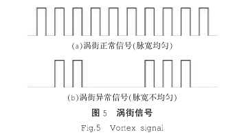 由于卡門渦街流量計信號是由旋渦頻率數(shù)值來.體現(xiàn)的,在正常情況下,旋渦分離頻率是穩(wěn)定的,只有當(dāng)傳感器發(fā)生異?;蚬r發(fā)生變化時,旋渦分離頻率才會有很大的變化,因此,通過觀察渦街流量傳感器頻率變化范圍的大小,可以很方便的分析出傳感器是否存在故障,不會出現(xiàn)模擬類傳感器在使用時因為零點(diǎn)偏移或模擬轉(zhuǎn)換誤差而帶來不易發(fā)現(xiàn)的計量誤差。渦街信號如圖5所示