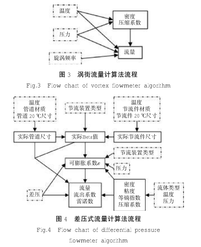 渦街流量計算法流程如圖3所示,圖中虛線框為外部采集信號,實(shí)線框為計算參數(shù);差壓式流量計算法流程如有圖4所示,圖中虛線框為外部信號及已知參數(shù),實(shí)線框為計算參數(shù)。