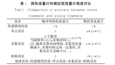 渦街流量計的旋渦分離頻率是與體積流量的大小成正比的,且分離頻率不受流體組分、密度、壓力溫度的影響。只要測量出旋渦個數(shù),就可以準(zhǔn)確計算出體積流量,而旋渦個數(shù)的測量是純數(shù)字概念,不存在測量數(shù)值上的誤差,讓渦街流量計具有了全量程范圍內(nèi)流量信號精確的特點(diǎn),是其它模擬類流量計不可比擬的優(yōu)點(diǎn)。傳感器線性均為18的脈沖型渦街和模擬類流量計精度對比如表1所示。