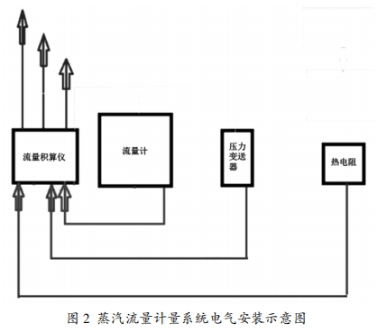 另一種安裝方式為電氣安裝,如圖2所示,需要注意引線長度、線徑和阻值,這些因素會對上傳到流量計(jì)算機(jī)的溫度差異帶來影響,所以在電氣安裝中需要配備UPS電源、防雷、接地等輔助設(shè)備,確保蒸汽流量計(jì)的長期穩(wěn)定可靠以及在極端惡劣天氣下也能保持正常使用。