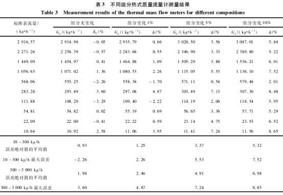 因此,根據(jù)表4結(jié)果分析,組分變化較大時,產(chǎn)生的附加誤差與熱式質(zhì)量流量計自身誤差相當(dāng)或更大,這種情況下由組分變化或設(shè)定不準(zhǔn)確產(chǎn)生的誤差不能忽略不計。本次研究以空氣作為介質(zhì),熱式氣體質(zhì)量流量計為2級的準(zhǔn)確度等級,得出在質(zhì)量流量在300~3000kg/h.時,組分變化達到臨界值為3%~4%時其附加誤差大于熱式氣體質(zhì)量流量計自身的誤差,進而對熱式測量造成不可忽略的影響;在質(zhì)量流量在10~300kg/h時組分變化達到臨界值4~5%以上會對熱式氣體質(zhì)量流量計的測量造成不可忽略的影響,這為實際工程上的應(yīng)用提供了一定的借鑒。