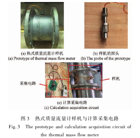 熱式氣體質(zhì)量流量計樣機如圖3(a)所示,內(nèi)部有測速探頭和測溫探頭,詳細(xì)的結(jié)構(gòu)如圖3(b)所示。該樣機信號線外接相應(yīng)的采集電路,如圖3(c)所示,圖的左側(cè)為計算采集電路[1849。樣機與計算采集電路結(jié)構(gòu)經(jīng)過多次空氣的實流測試,其與標(biāo)準(zhǔn)表的測量誤差滿足國家JJG1132-2017《熱式氣體質(zhì)量流量計檢定規(guī)程》中的2級的準(zhǔn)確度等級,其量程范圍為10~3000kg/h,量程比達300:1,根據(jù)檢定規(guī)程10~300kg/h范圍內(nèi)誤差為±2%,300~3000kg/h范圍內(nèi)誤差為±4%。