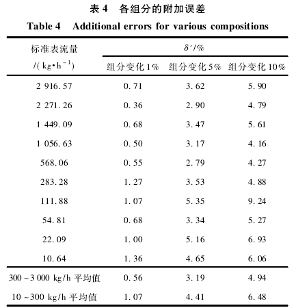 表4為各組分的附加誤差,附加誤差表示熱式氣體質(zhì)量流量計僅由于氣體組分的變化對質(zhì)量流量測量的誤差,其定義式為: