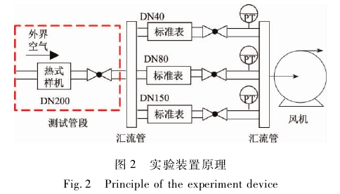 熱式氣體質(zhì)量流量計實驗測試所用裝置是在天津大學(xué)流量實驗室的氣體流量實驗裝置。實驗裝置采用微負(fù)壓法,通過調(diào)節(jié)風(fēng)機的頻率來調(diào)節(jié)氣體流量。標(biāo)準(zhǔn)表由多路并聯(lián)的渦輪流量計組成,精度等級為1級,口徑分別為40mm、80mm、150mm。實驗裝置原理如圖2所示。