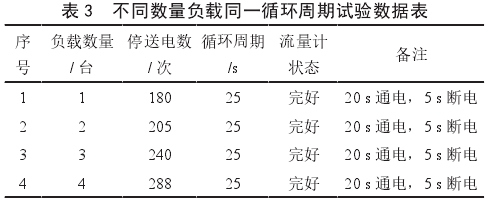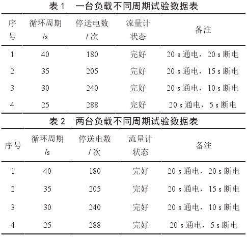 一臺(tái)負(fù)載不同循環(huán)周期停送電的實(shí)試驗(yàn)情況,如表1所示。兩臺(tái)負(fù)載不同循環(huán)周期停送電試驗(yàn)情況,如表2所示。25s循環(huán)周期不同數(shù)量負(fù)載停送電試驗(yàn)情況,如表3所示。