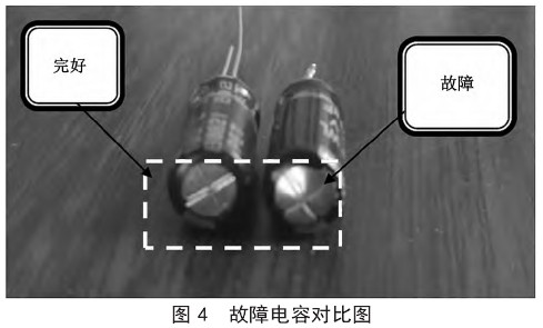 檢測(cè)過(guò)程中發(fā)現(xiàn),此電容損壞的主要現(xiàn)象為電容.鼓包。故障電容對(duì)比圖,如圖4所示。