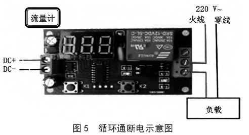 采用無(wú)限循環(huán)定時(shí)開(kāi)關(guān)模塊,對(duì)更換后更大容量的電容進(jìn)行連續(xù)通斷電實(shí)驗(yàn)。根據(jù)對(duì)電磁流量計(jì)開(kāi)機(jī)時(shí)間的計(jì)量發(fā)現(xiàn),完全進(jìn)入開(kāi)機(jī)狀態(tài)需要20s,因此設(shè)置通電時(shí)間為20s。循環(huán)通斷電示意圖如圖5所示。