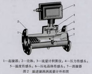 旋進(jìn)漩渦流量計(jì)主要由起旋器、文丘里管、消旋器和檢測元件組成。其結(jié)構(gòu)原理如圖1所示,外形如圖2所示,當(dāng)流體流進(jìn)旋進(jìn)漩渦流量計(jì)后,在起旋器的作用下,被強(qiáng)制圍繞中心線旋轉(zhuǎn),產(chǎn)生漩渦流,漩渦流在文丘利管中旋進(jìn),到達(dá)收縮段突然節(jié)流后,使漩渦流加速,當(dāng)通過擴(kuò)散段時(shí),漩渦中心沿一錐形旋線進(jìn)動。此時(shí),由兩個(gè)壓電傳感器檢測到的進(jìn)動頻率信號經(jīng)前置電路放大,濾波,整形后轉(zhuǎn)換為兩路與流速正比的脈沖信號,經(jīng)積算儀中處理電路進(jìn)行相應(yīng)的比較和判斷,并剔除外來干擾信號后,正常的流量信號與溫度,壓力傳感器檢測到的信號-起送人智能流量積算儀進(jìn)行運(yùn)算處理,并把流體的體積流量和總量直接顯示于LCD屏上。