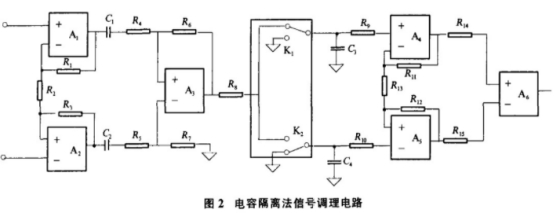 現(xiàn)在很多電磁流量計(jì)的信號(hào)處理方法采用了電容隔離法,電容隔離法是將零點(diǎn)漂移近似作為直流.處理的一種方法,即通過電容耦合來隔離零點(diǎn)漂移干擾,實(shí)現(xiàn)對(duì)感應(yīng)電勢(shì)信號(hào)的提取.放大處理.基本電路如圖2.