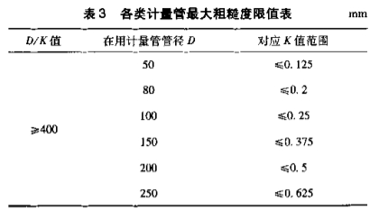 由于標準只對D/K≥400的情況提出了規(guī)定,因此現(xiàn)場在用的部分計量管是無法按實際粗糙度進行修正的。就目前采用的積算軟件而言,K值最大也只能修正到D/K=400的情況,表3列出了氣田內(nèi)目前常用的幾種測量管可以進行修正的粗糙度值。