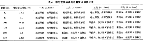 由此可得,川西氣田現(xiàn)用的粗糙度修正系數(shù)0.15mm不合理,應(yīng)依據(jù)計量管的實際粗糙度情況,并結(jié)合標準進行取值。對沒有超過限值的按實際K值修正,對超過限值的,按最大限值進行修正。下面(見表4)將給出不同管徑的各類計量管應(yīng)采用的修正值。
