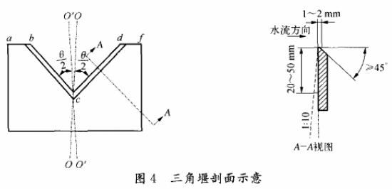 4)堰板項(xiàng)面ab,df在同一水平面內(nèi),與三角形缺口角度平分線O'O''成90°。