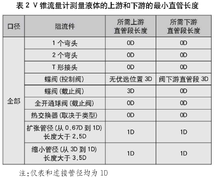 (2)液體測(cè)量,雷諾數(shù)范圍(Re)>200000,V錐流量計(jì)測(cè)量液體的上游和下游的最小直管長(zhǎng)度見(jiàn)表2。若≥0.65,表中的直管段長(zhǎng)度需要增加1D.。