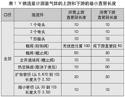 (1)氣體測(cè)量,雷諾數(shù)范圍(Re)>200000,V錐流量計(jì)測(cè)量氣體的上游和下游的最小直管長(zhǎng)度見(jiàn)表1。若≥0.65,表中的直管段長(zhǎng)度需要增加1D。