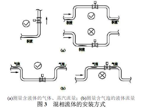 渦街流量計(jì)在管道上可以水平、垂直或傾斜安裝,但測(cè)量混相流體時(shí),測(cè)量精度得不到保障,需保證測(cè)量流體充滿(mǎn)管道,避免產(chǎn)生混相流,根據(jù)混相流體的特點(diǎn),選擇合適的安裝方式,具體的安裝方式如圖3 所示。