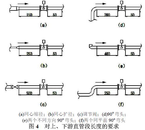 渦街流量計(jì)必須在穩(wěn)定的流束場(chǎng)內(nèi),有一定的直管段要求,直管的長(zhǎng)度會(huì)影響精度,必須保證上、下游直管段有一定的長(zhǎng)度,通常是上游直管段>10D,下游直管段>5D,還要結(jié)合現(xiàn)場(chǎng)安裝情況進(jìn)行調(diào)整,如果上游有彎頭或者閥門(mén),直管段相應(yīng)的需要加長(zhǎng),具體的安裝要求如圖4 所示。