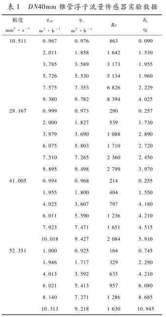 對量程范圍1~10m³/h、精度等級1.5級的DN40mm浮子流量傳感器進行實驗研究。qxo是刻度流量,qvomax為流量傳感器量程上限,qv是實際流量,δ1是滿度誤差,δ1=|(qy0-qy)1/qxomax100%,實驗數(shù)據(jù)見表1。