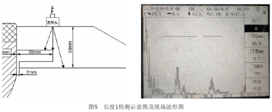 利用流量計直探頭得到兩個回波信號(分別為環(huán)室反射信號、平底反射信號),根據(jù)超聲波大平底面回波聲壓與距離的反比關(guān)系,△12=201gx2/x1,以DG1為例,計算出兩個回波差值△=5db,根據(jù)閘門移動或設(shè)置雙閘門,比較回波的db差值,來判斷直探頭發(fā)射點(diǎn)是否處在環(huán)室的邊緣。最后通過鋼直尺測量焊縫邊緣與探頭中心的水平距離,即得到環(huán)室長度1。
