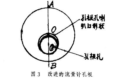 不論是孔板生產(chǎn)單位,還是自己加工。都是圓孔在孔板中心,并且安裝時(shí),務(wù)必使其孔心與管道的軸心保持一致,這就是造成孔板流量計(jì)被堵塞的原因。所以,若要使雜質(zhì)順利通過(guò)孔板,就要對(duì)孔板和安裝方法作一些改進(jìn),改進(jìn)后的孔板及安裝如圖3、圖4??椎闹行脑谡麄€(gè)2孔板外徑三之二處為宜(即O'A=2/3AB),其喇叭口也稍作改進(jìn)。