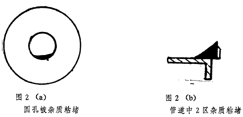 在停車一段時(shí)間后,當(dāng)酸通過(guò)管道時(shí),管道中的雜質(zhì)和酸中的聚合物以及雜質(zhì),由于受重力的作用,一般沿管道壁底部隨著酸向前移動(dòng)。當(dāng)流體通過(guò)孔板流量計(jì)時(shí),在(圖1)1區(qū)和2區(qū)產(chǎn)生兩個(gè)死角,形成死區(qū),雖然有一部分雜質(zhì),沿著流線通過(guò)流量計(jì),但絕大多數(shù),被淤積于2區(qū),時(shí)間一長(zhǎng),淤積的雜質(zhì)就越多,淤積到一定程度,雜質(zhì)就慢慢的粘附在孔板巾孔的邊緣,形成如圖(2)(a)(b)所示的形狀。
