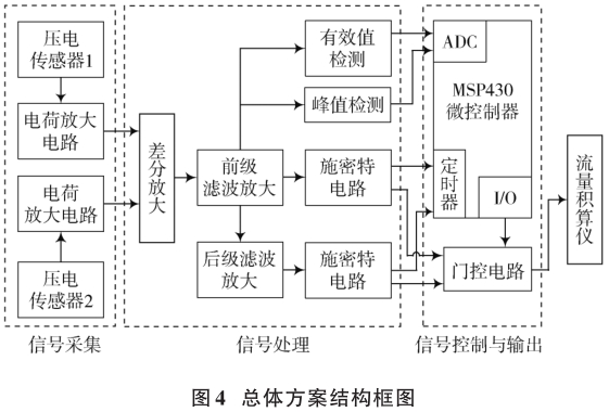 信號(hào)處理模塊的硬件結(jié)構(gòu)如圖4所示。通過電荷放大電路與差分放大電路,再結(jié)合電壓跟隨電路,將其轉(zhuǎn)換成參考電壓為均值的正弦信號(hào);輸入的正弦信號(hào)經(jīng)過前級(jí)濾波放大,去除電路中的高頻噪聲信號(hào),再經(jīng)過后級(jí)濾波放大得到低頻段信號(hào);兩路信號(hào)經(jīng)施密特電路整形得到脈沖信號(hào),由MSP430的定時(shí)器計(jì)數(shù);同時(shí),根據(jù)其ADC模塊采集前級(jí)濾波放大信號(hào)的有效值和峰值,進(jìn)行判別和比較,控制對(duì)應(yīng)I/O口的電平,選擇兩路信號(hào)中符合要求的信號(hào)輸出至流量積算儀。