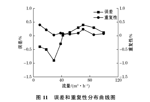 測量誤差與重復(fù)性曲線如圖11所示,低流量區(qū)的最大測量誤差和重復(fù)性分別為-0.5%和0.4%,高流量區(qū)的最大測量誤差分別為-0.9%和0.24%,根據(jù)旋進旋渦流量計檢定規(guī)程要求,低流量區(qū)8~24m'/h最大允許誤差范圍為3.0%,重復(fù)性小于1.0%;高流量區(qū)24~120m3/h最大允許誤差范圍為1.5%,重復(fù)性小于0.5%。綜合以上分析,所有指標均在規(guī)定的范圍內(nèi),符合旋進旋渦流量計的性能要求。