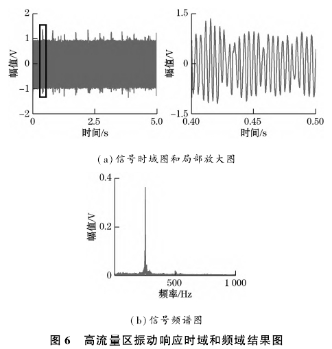 高流量區(qū)以流量點41.7m3/h的瞬時流量信號為例。在流量穩(wěn)定的情況下完成采集并去除信號中的直流分量并進行處理,由于對信號已進行低通濾波處理,頻譜分析得到的結(jié)果中1kHz以上的信號對應(yīng)幅值基本為0,在圖中不做展示,得到的無振動情況下的旋渦信號的時域與頻域結(jié)果圖如圖5所示。從結(jié)果圖中均可以看出,旋渦信號近似于正弦信號,與理論分.析相符,信號頻率即為頻譜圖中尖峰對應(yīng)的頻率,通過FFT計算得到結(jié)果為258.1Hz。